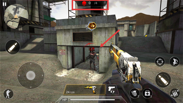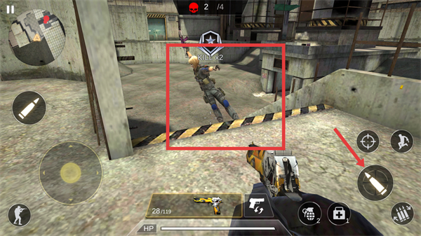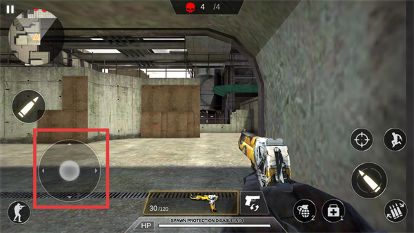 1、利用红色框内的虚拟摇杆,控制角色在场景中移动,寻找敌人。