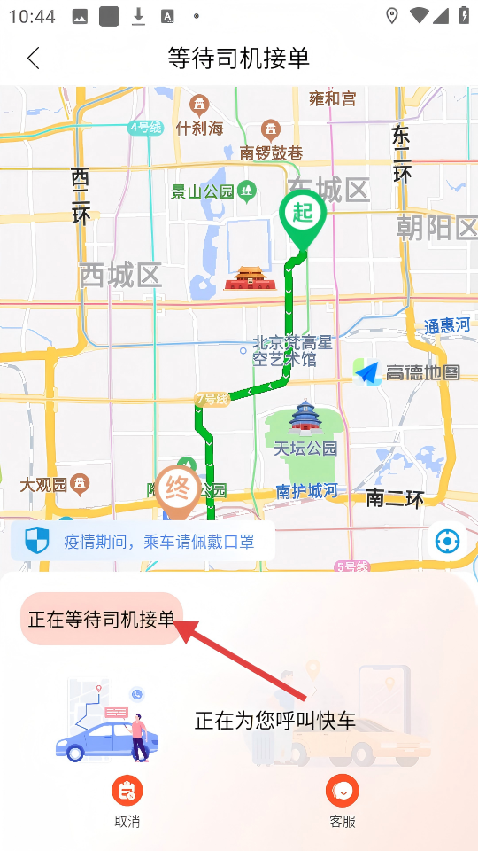 4、在打车软件界面当显示【等待司机接单】时系统【正在为您呼叫快车】可点击【取消】或【客服】按钮操作。