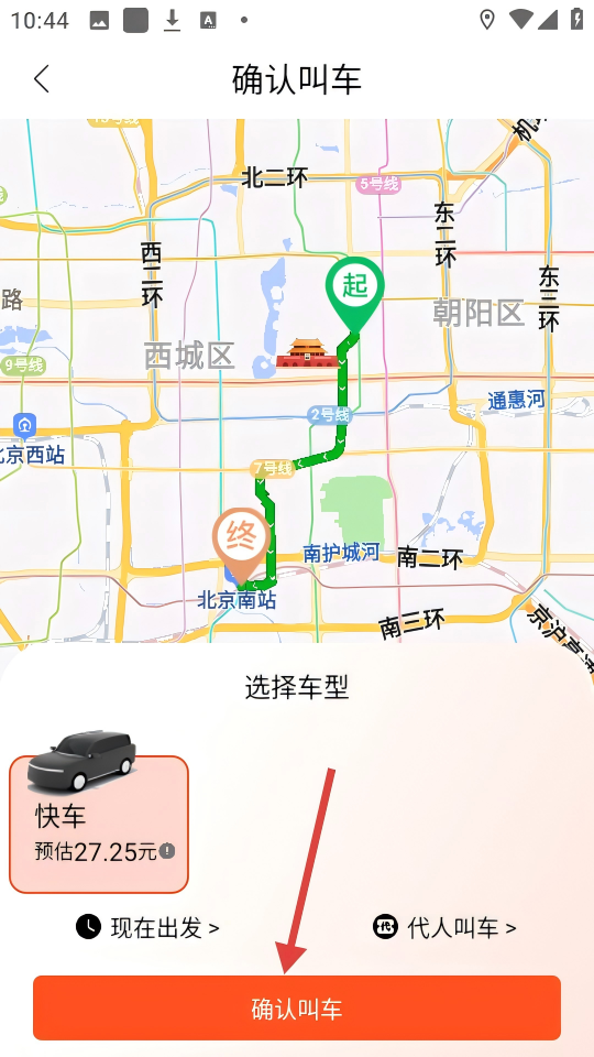 3、在【确认叫车】界面,选择【快车】车型点击【确认叫车】按钮以完成叫车。