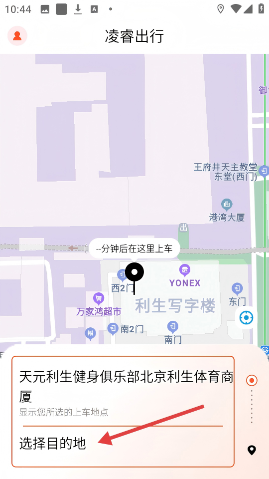 1、在【凌睿出行】应用中确认上车地点后点击【选择目的地】以设置行程。
