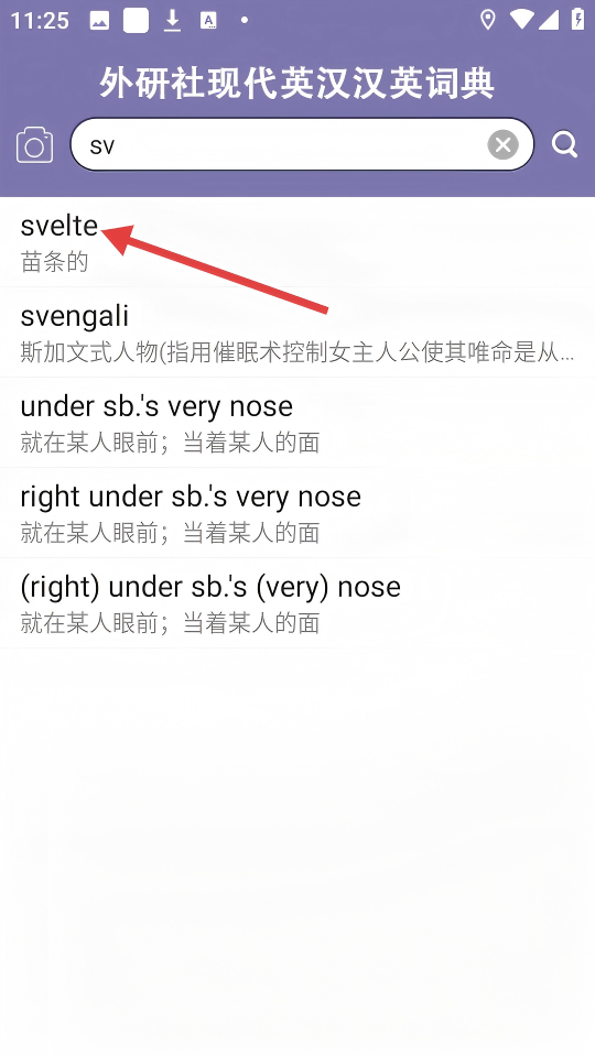 2、输入【sv】,点击【svelte(苗条的)】查看释义。