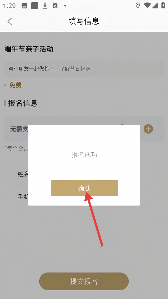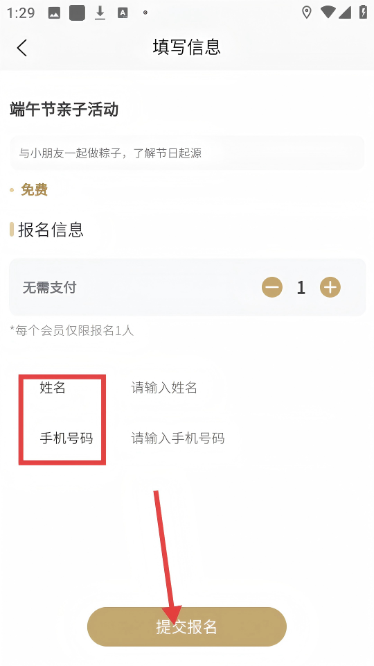 3、在【端午节亲子活动】的填写信息页,输入【姓名】【手机号码】,点击【提交报名】。
