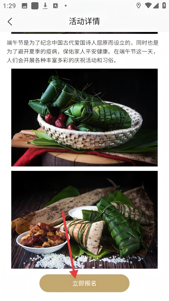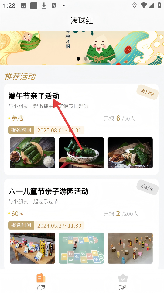 1、在推荐活动中,点击【端午节亲子活动】,进入活动详情页。