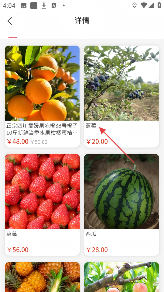 3、在详情页中,点击【蓝莓】商品,查看该商品的具体信息。
