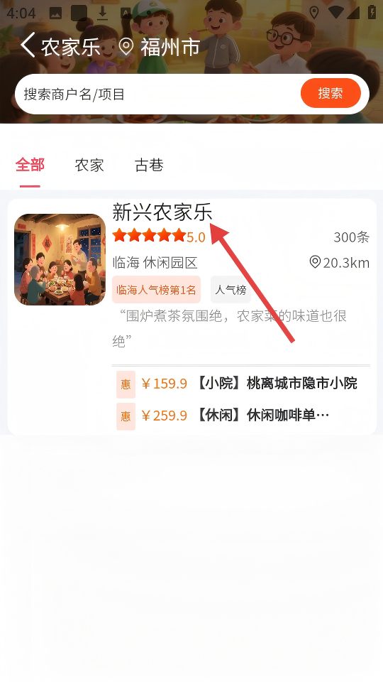 2、在农家乐列表中,点击【新兴农家乐】,进入该农家乐的详情页面。