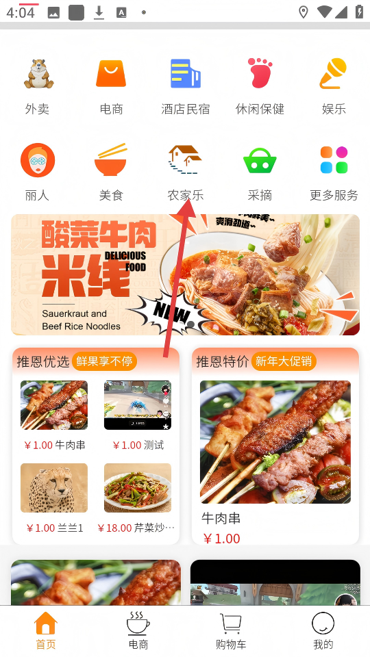 1、在首页点击【农家乐】图标,进入农家乐分类页面。