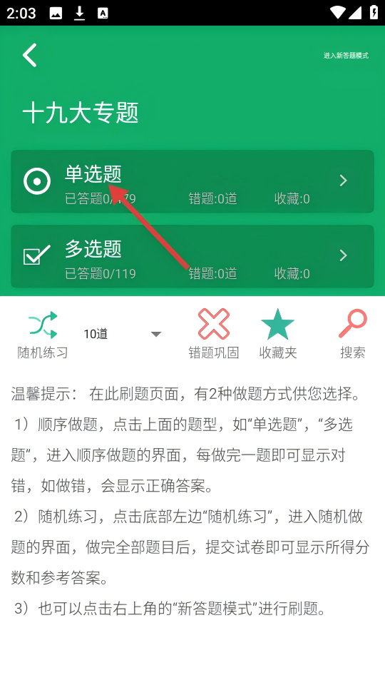 3、在十九大专题题型选择页,点击【单选题】,进入单选题答题页。