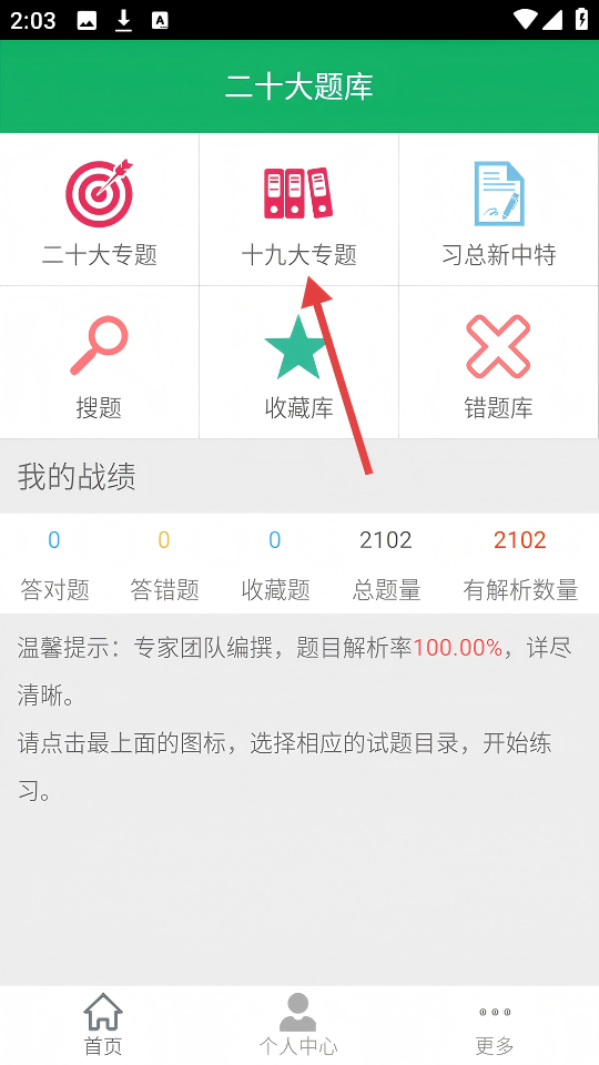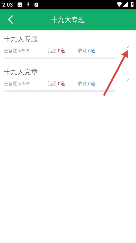 2、在十九大专题页面,点击【十九大专题】右侧箭头,进入题型选择页。
