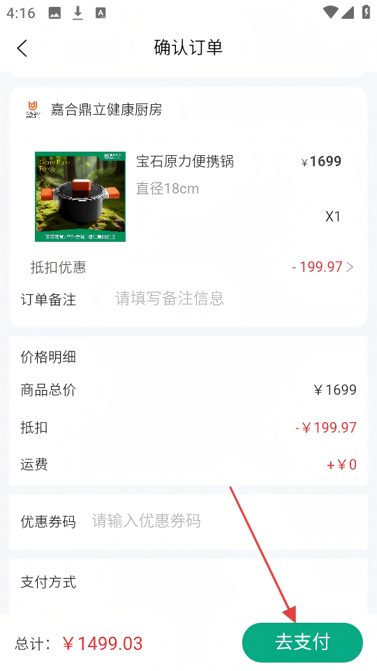 4、在确认订单页,确认商品及优惠等信息,点击【去支付】。