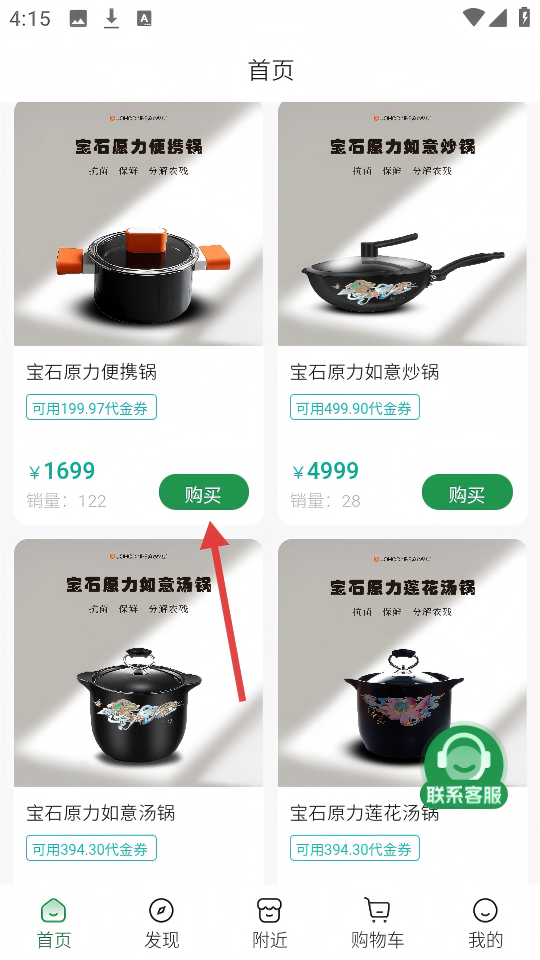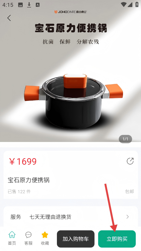 1、在首页,点击宝石原力便携锅旁的【购买】,进入商品详情页。