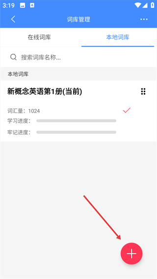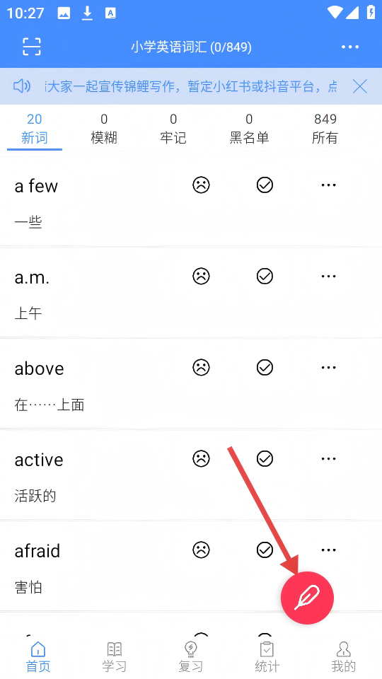 3、下载后,返回首页,点击右下角红色笔形按钮,可进入默写等学习环节。