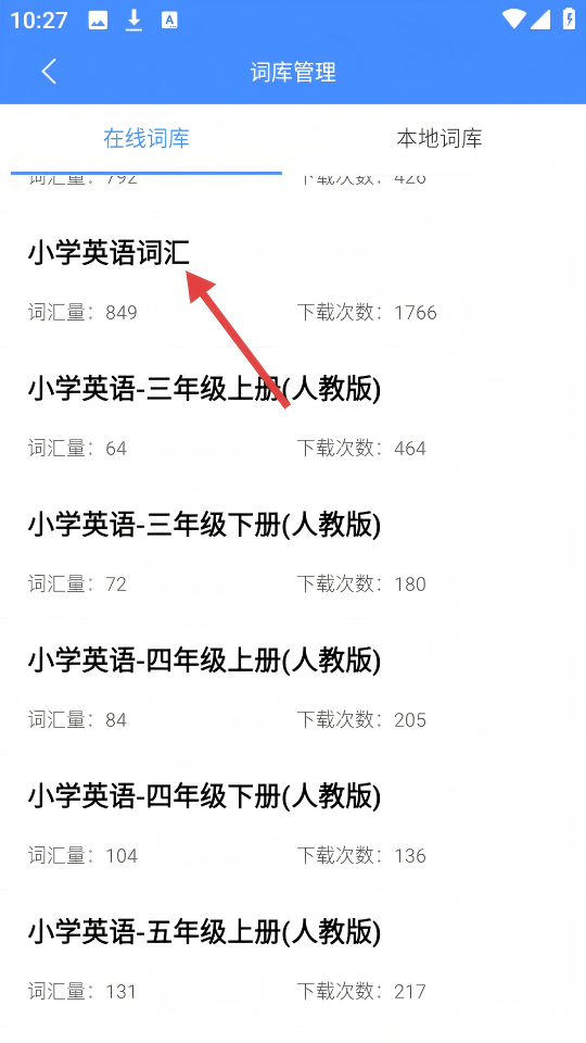 1、在【词库管理】的【在线词库】板块,点击【小学英语词汇】。
