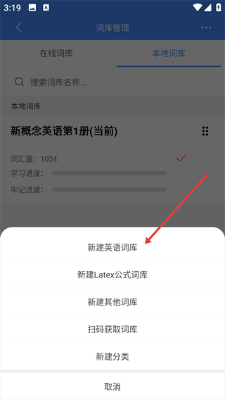 4、在弹出的菜单中,选择“新建英语词库”选项,完成词库新建操作。