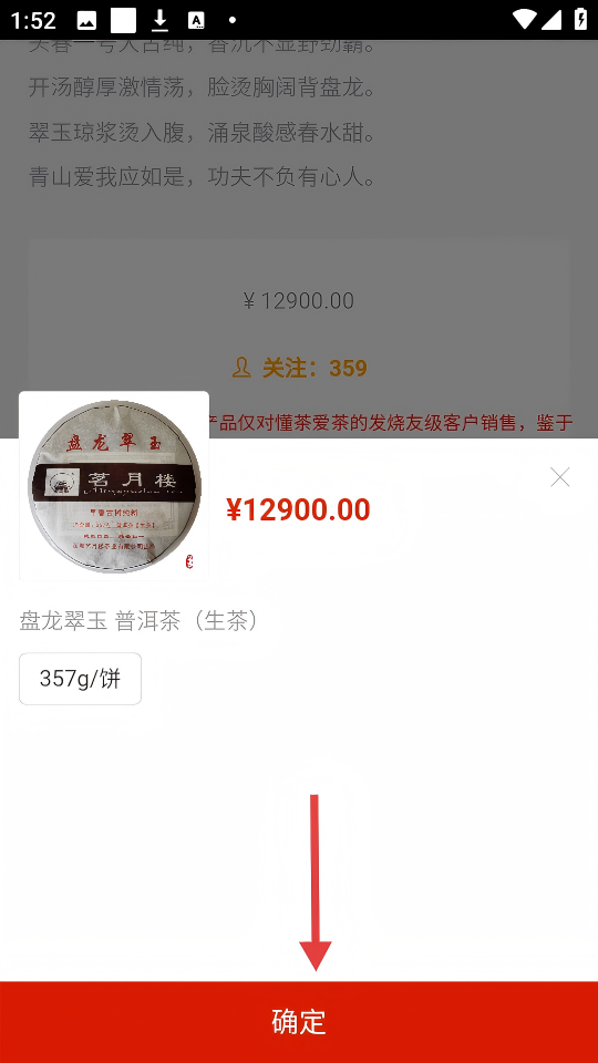 4、选择【盘龙翠玉普洱茶】规格为【357g/饼】后,点击底部【确定】按钮,确认商品选择。