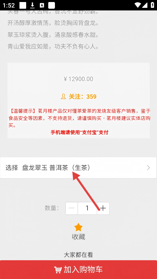 3、在商品详情页,设置购买数量,点击【盘龙翠玉普洱茶(生茶)】。