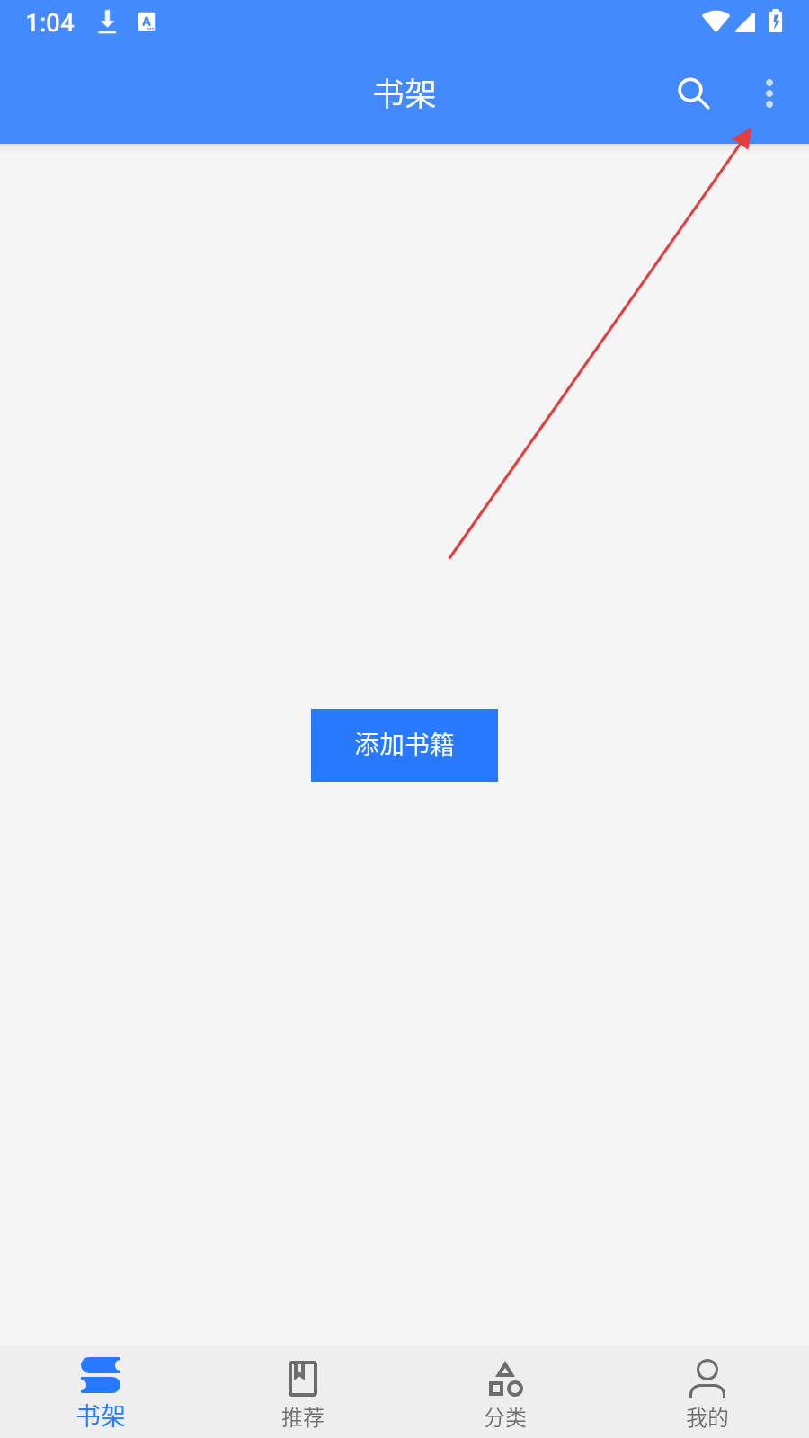 1、在书架页面,点击右上角【三点图标】,呼出功能菜单。