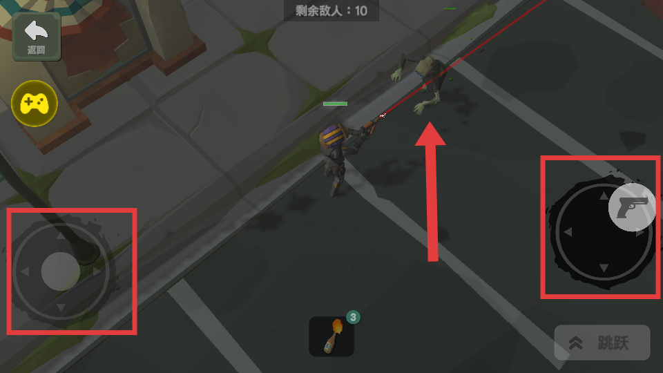 3、通过左侧方向轮盘操控幸存者移动,右侧攻击按钮射击僵尸,消灭场上所有敌人。