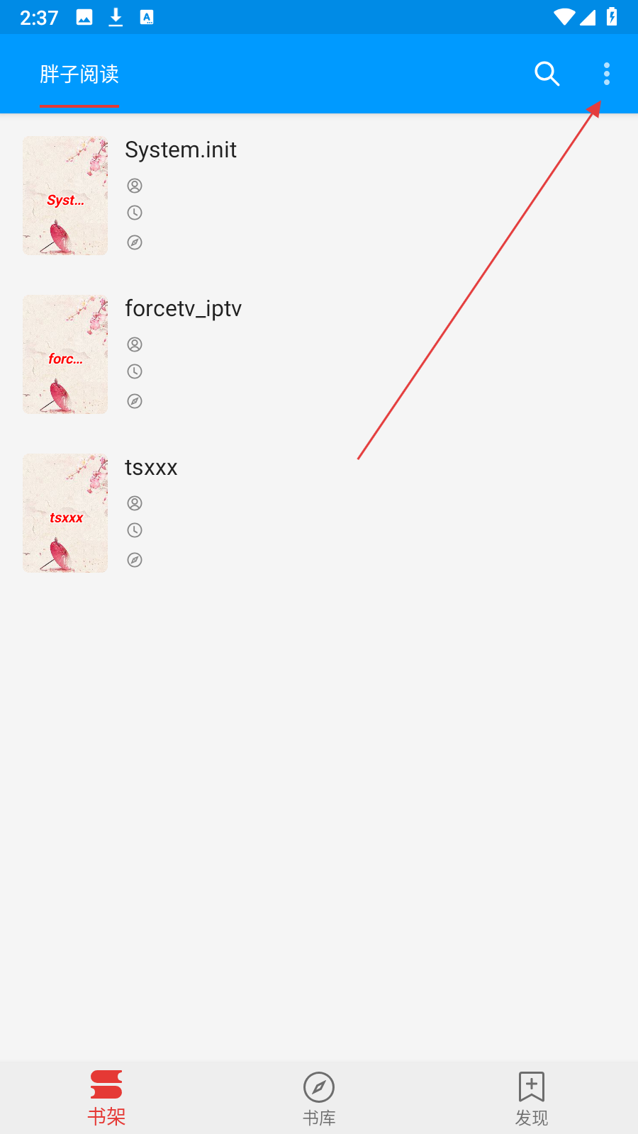 1、在书架页面,点击右上角【三点图标】,展开功能菜单。