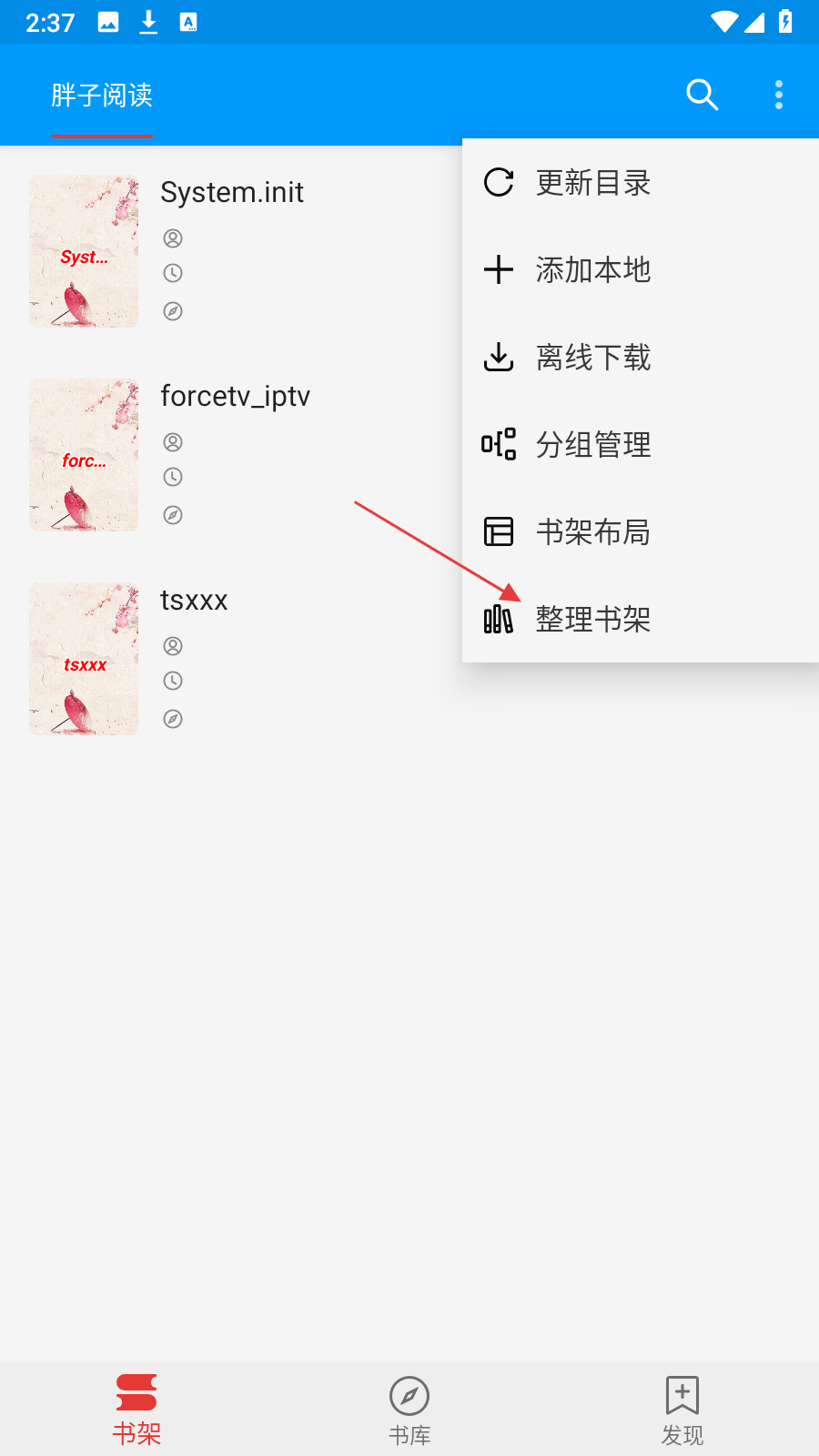 2、在功能菜单中,点击【整理书架】,进入整理书架页面。