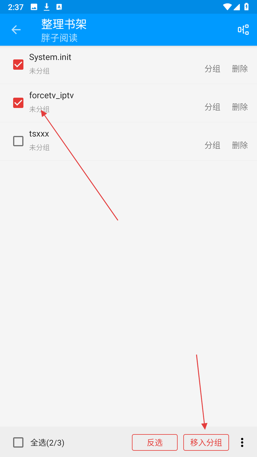 3、在整理书架页面,勾选【要整理的书籍】,点击【移入分组】。
