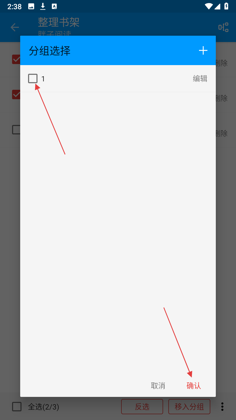 4、在分组选择弹窗中,勾选【目标分组】,点击【确认】完成书籍分组整理。