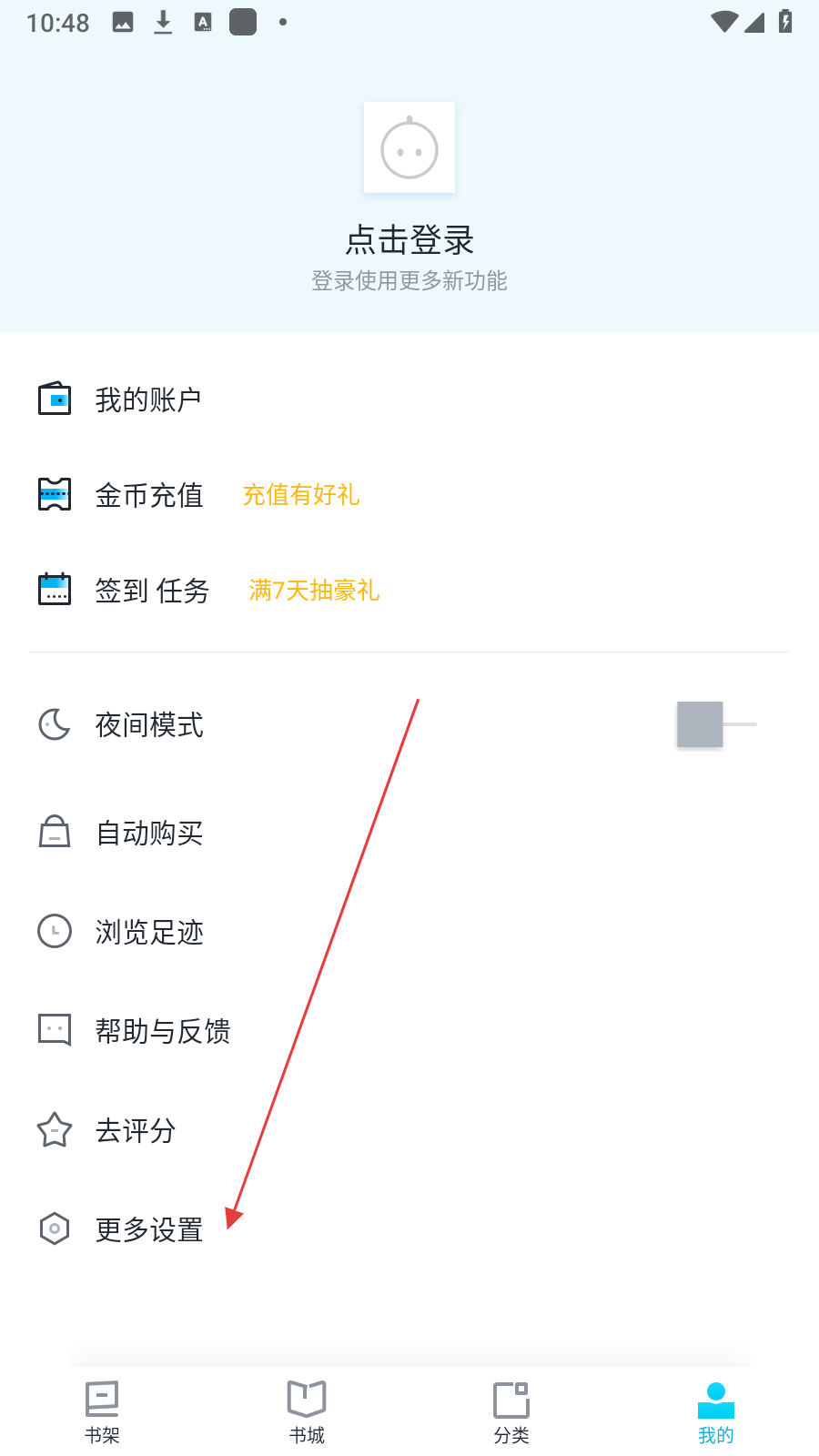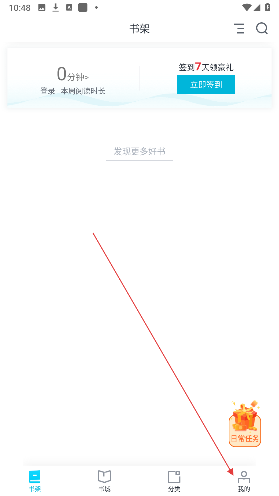 1、在书架页面,点击底部【我的】,进入个人设置页面。