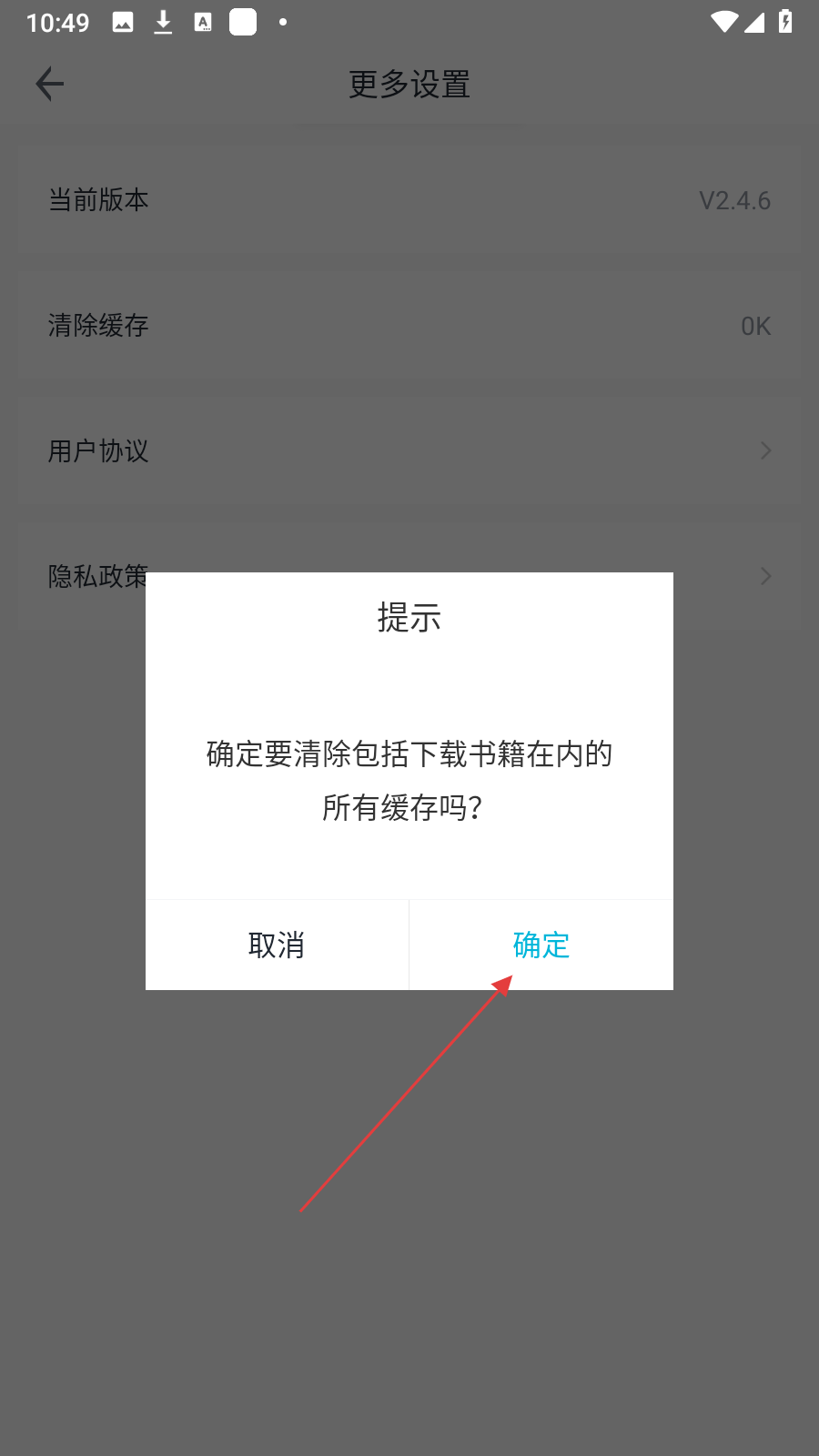 4、在提示框中,点击【确定】,即可清除包括下载书籍在内的所有缓存。