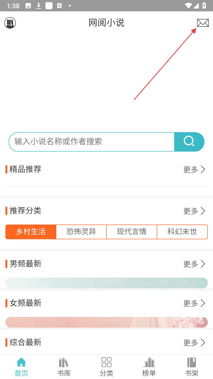 2、在网阅小说首页,点击【右上角信封图标】,进入意见反馈页面。
