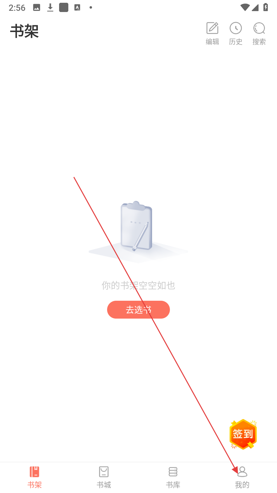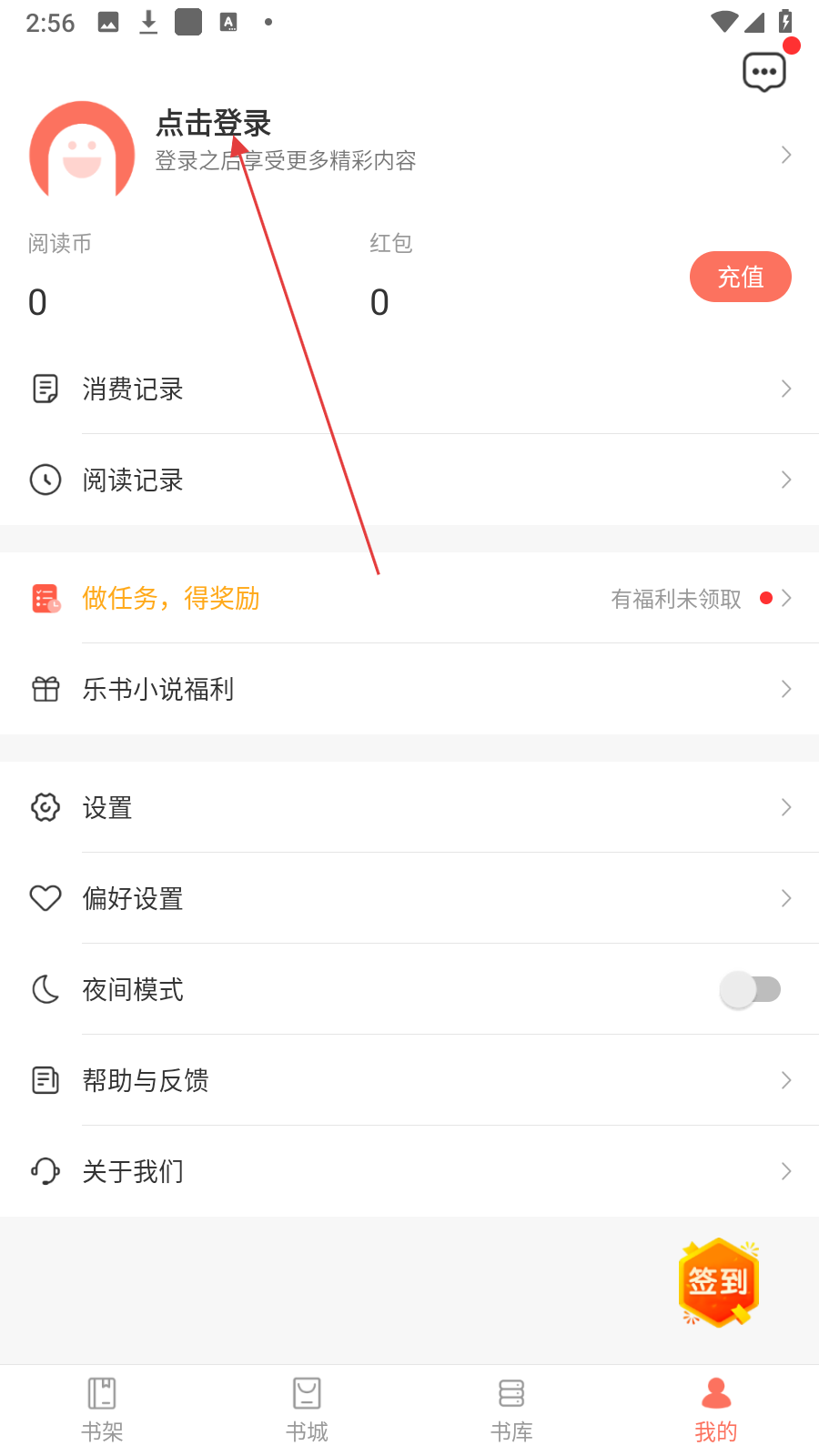 1、在书架页面,点击底部【我的】,进入个人页面。