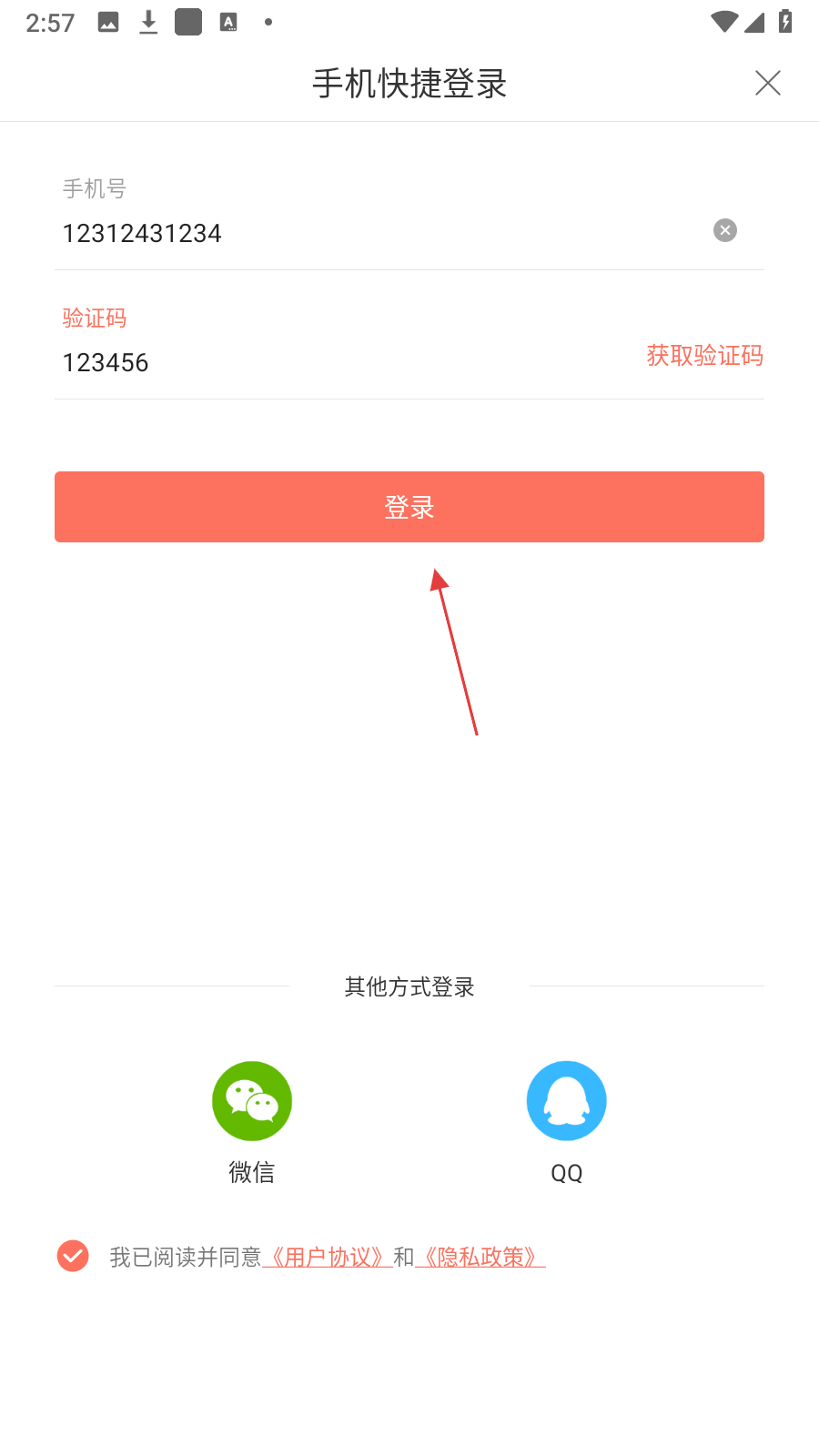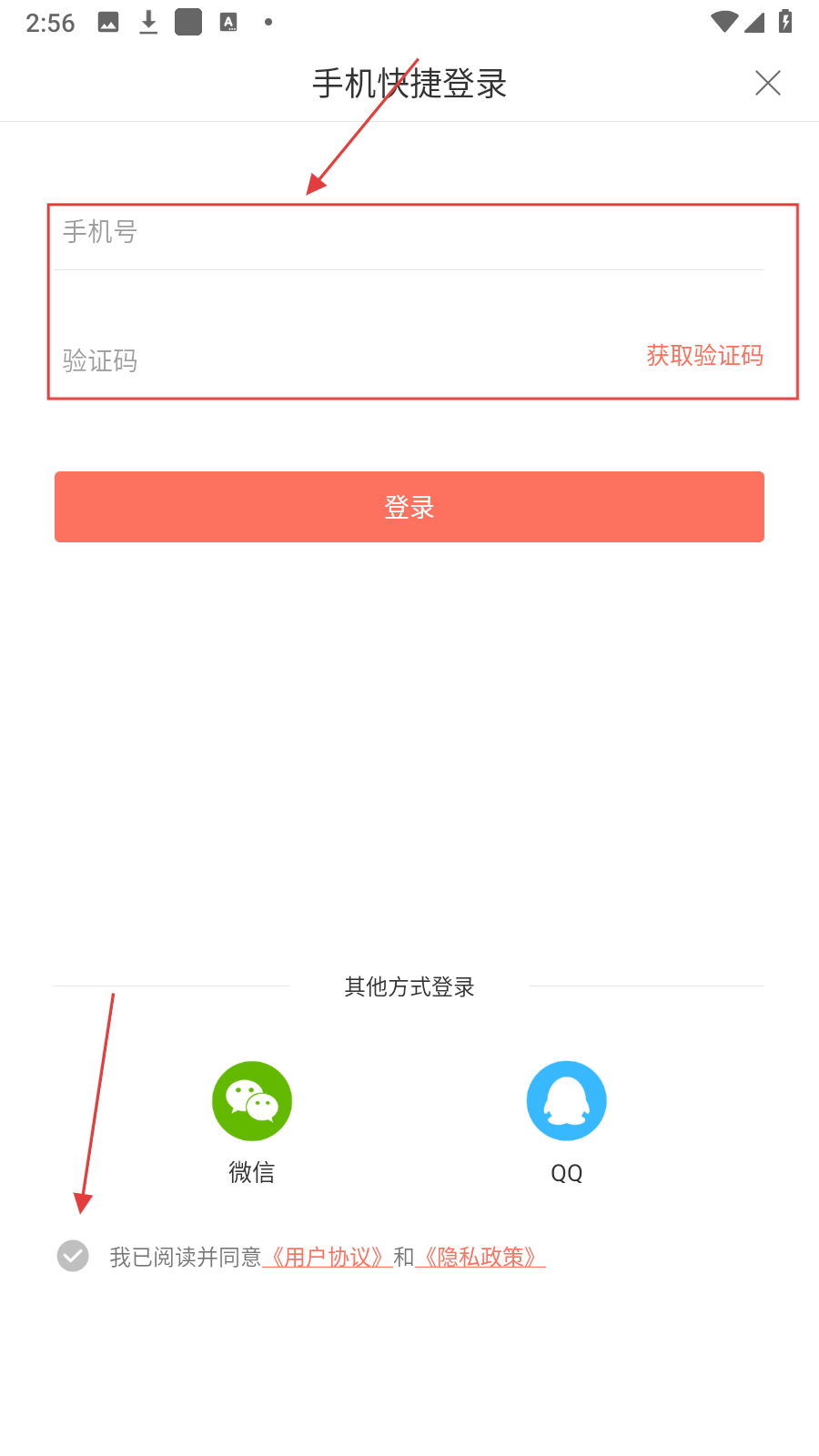 3、在手机快捷登录页面,输入【手机号、验证码,勾选同意协议】。
