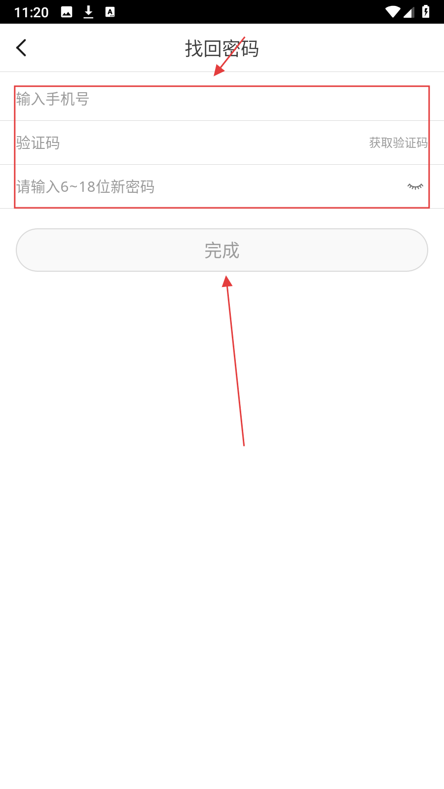 4、输入【手机号、验证码和新密码】,点击【完成】,即可完成密码找回。