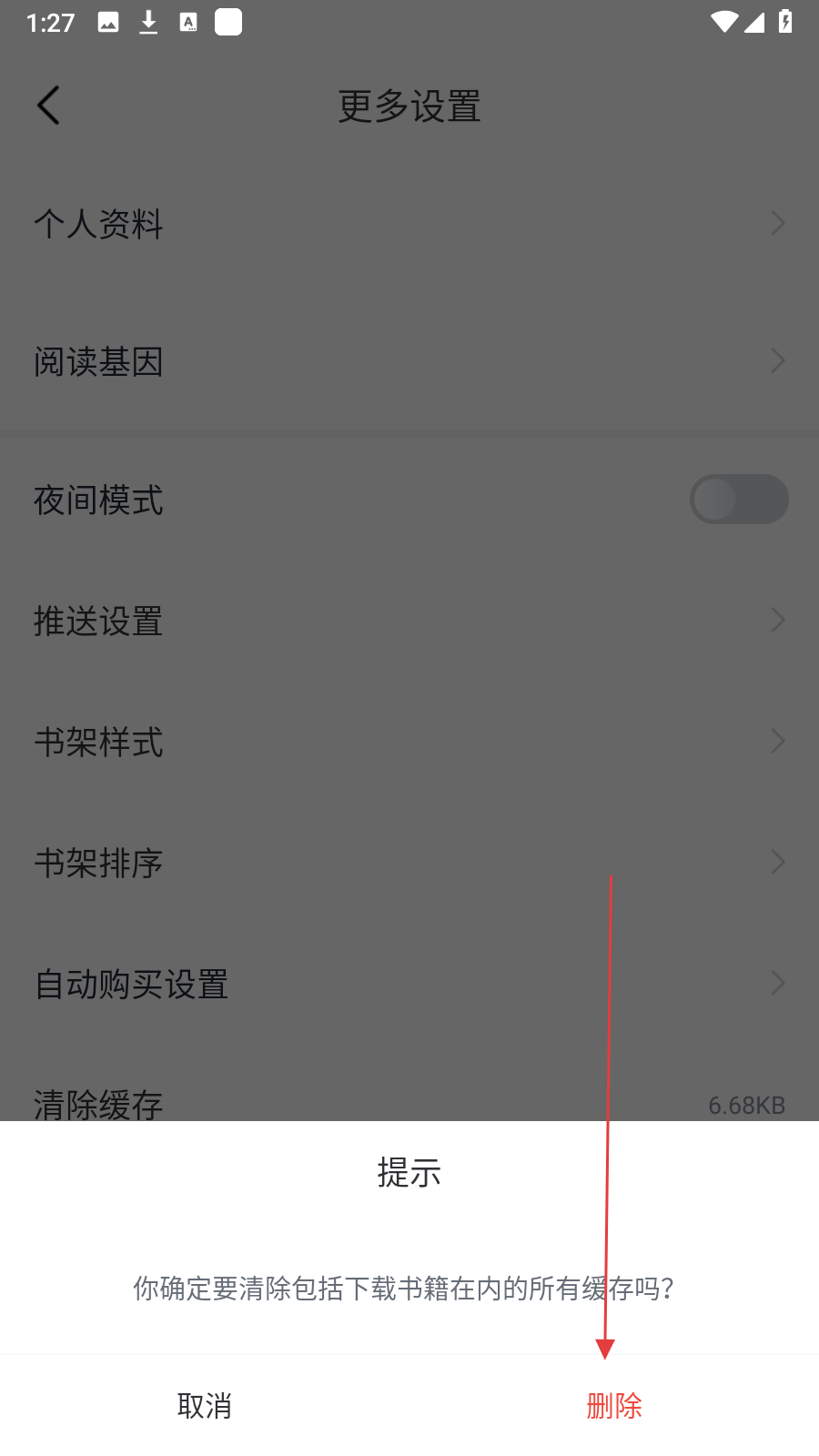 4、在提示框中,点击【删除】,即可清除包括下载书籍在内的所有缓存。