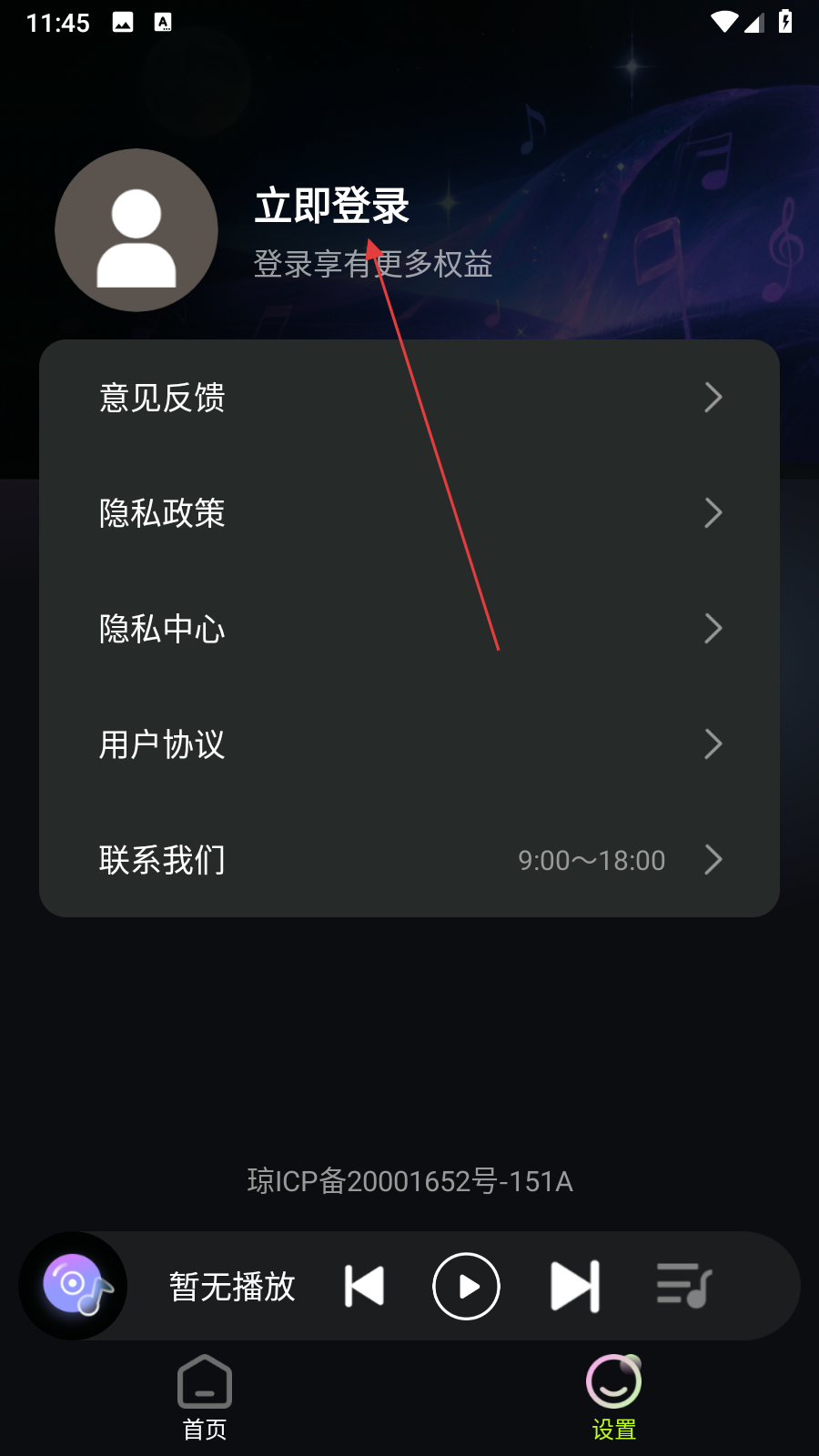 1、进入音乐应用首页,点击底部【设置】,进入设置页面。