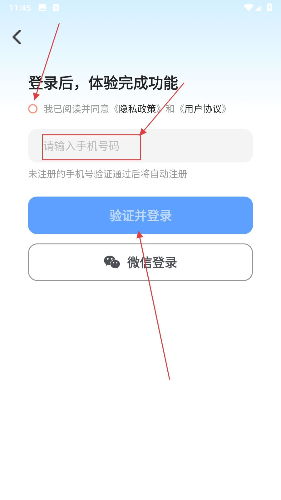 3、在登录界面,勾选【同意协议】,输入【手机号码】,点击【验证并登录】。