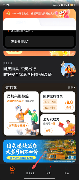 1、打开【嘀嗒出行】App,点击下方的【顺风车主】按键,要进入认证界面了哦。