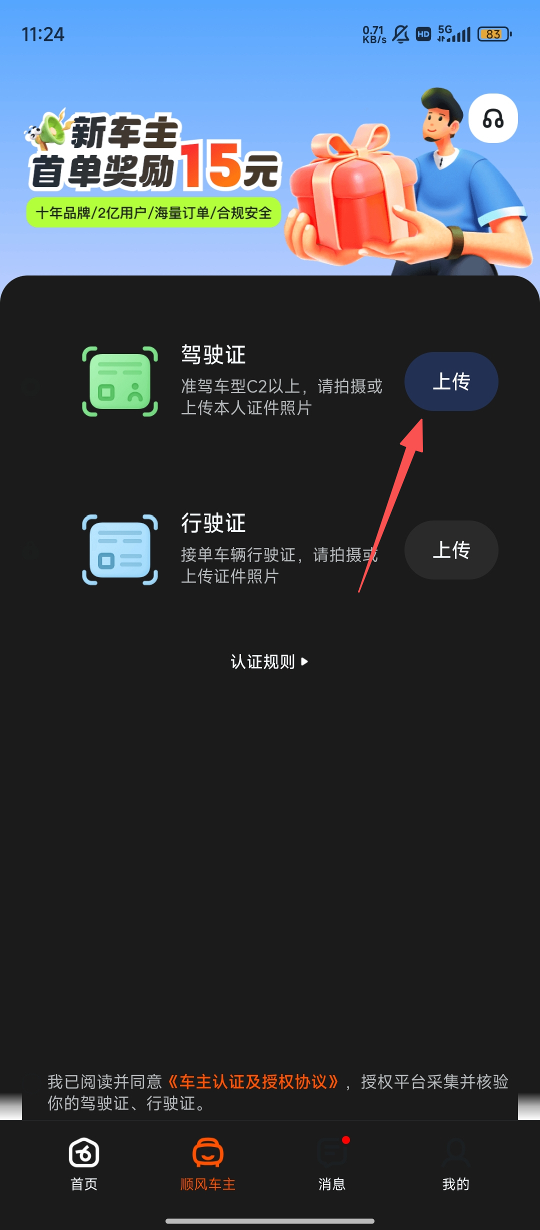 2、接着我们点击【驾驶证】旁的【上传】按键,提前准备好证件吧。