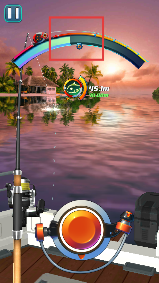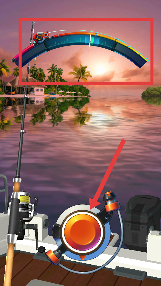 1、钓鱼时留意上方鱼竿力度条,适时点击下方橙色按钮抛出。