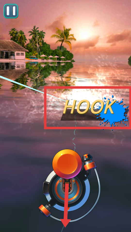 2、当屏幕出现【HOOK】提示时,迅速【向后】拉扯橙色箭头指向的收线按钮,确保鱼钩牢牢钩住鱼。