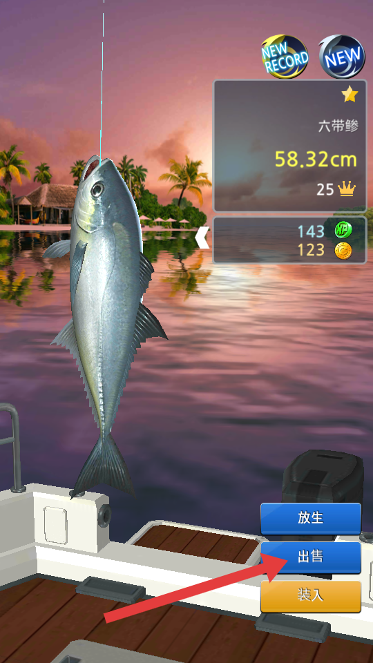 4、钓到鱼后,如六带鲹,可点击【出售】按钮获取金币和经验,积累资源以提升钓鱼装备和能力。