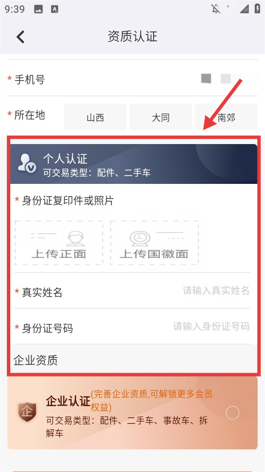4、若车辆需认证会员可见,进入资质认证页面,完成个人认证以解锁车辆查看和竞拍权限。