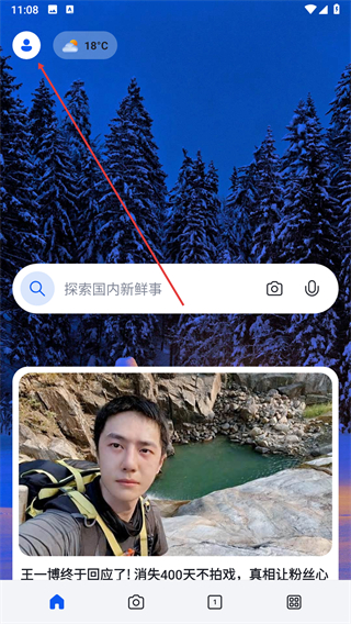 1、打开微软必应app主界面,点击左上角的个人图标进入个人功能页面。