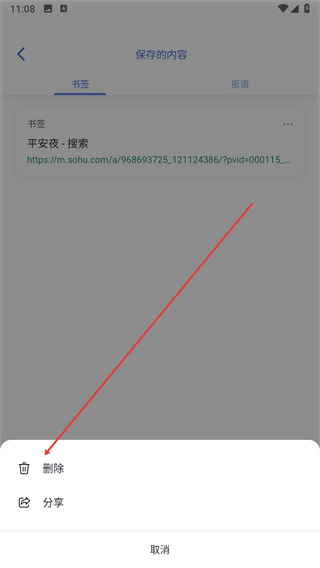 4、在弹出的操作选项菜单中找到删除选项,点击该选项完成书签记录的删除。