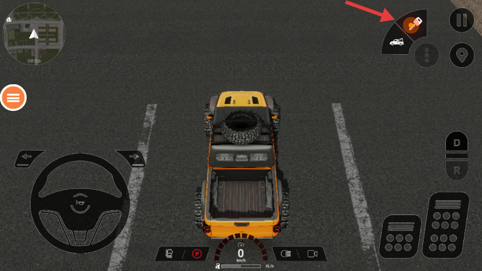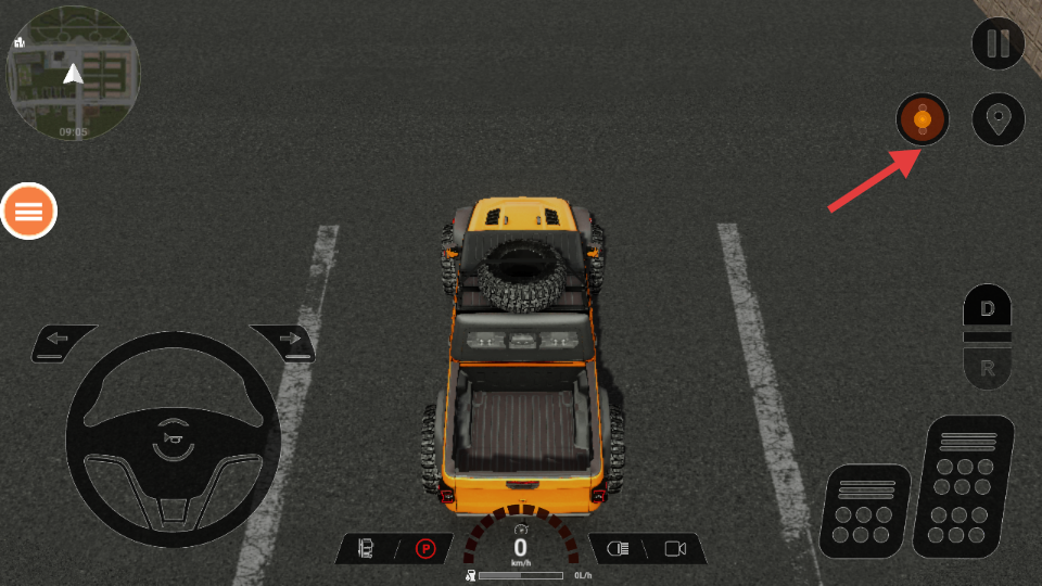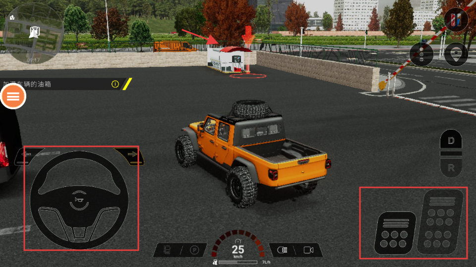 4、利用左侧方向盘和右侧控制按键,操控黄色越野车前往加油站。