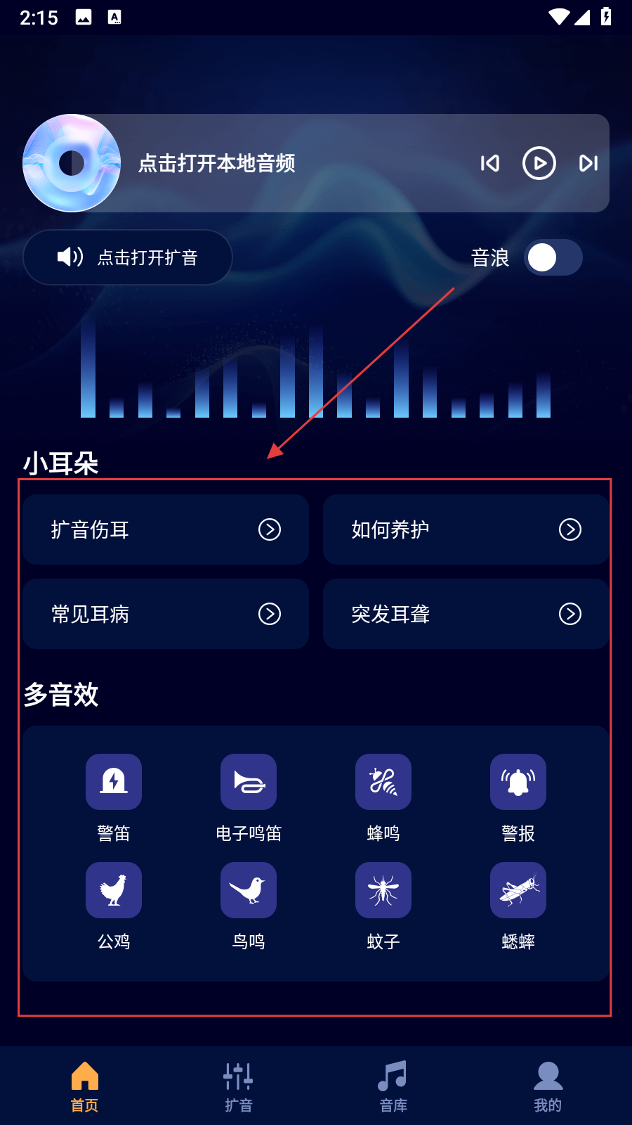 1、在首页可查看【小耳朵相关耳健康知识】,还能在多音效里【选择警笛、鸟鸣等音效体验】。