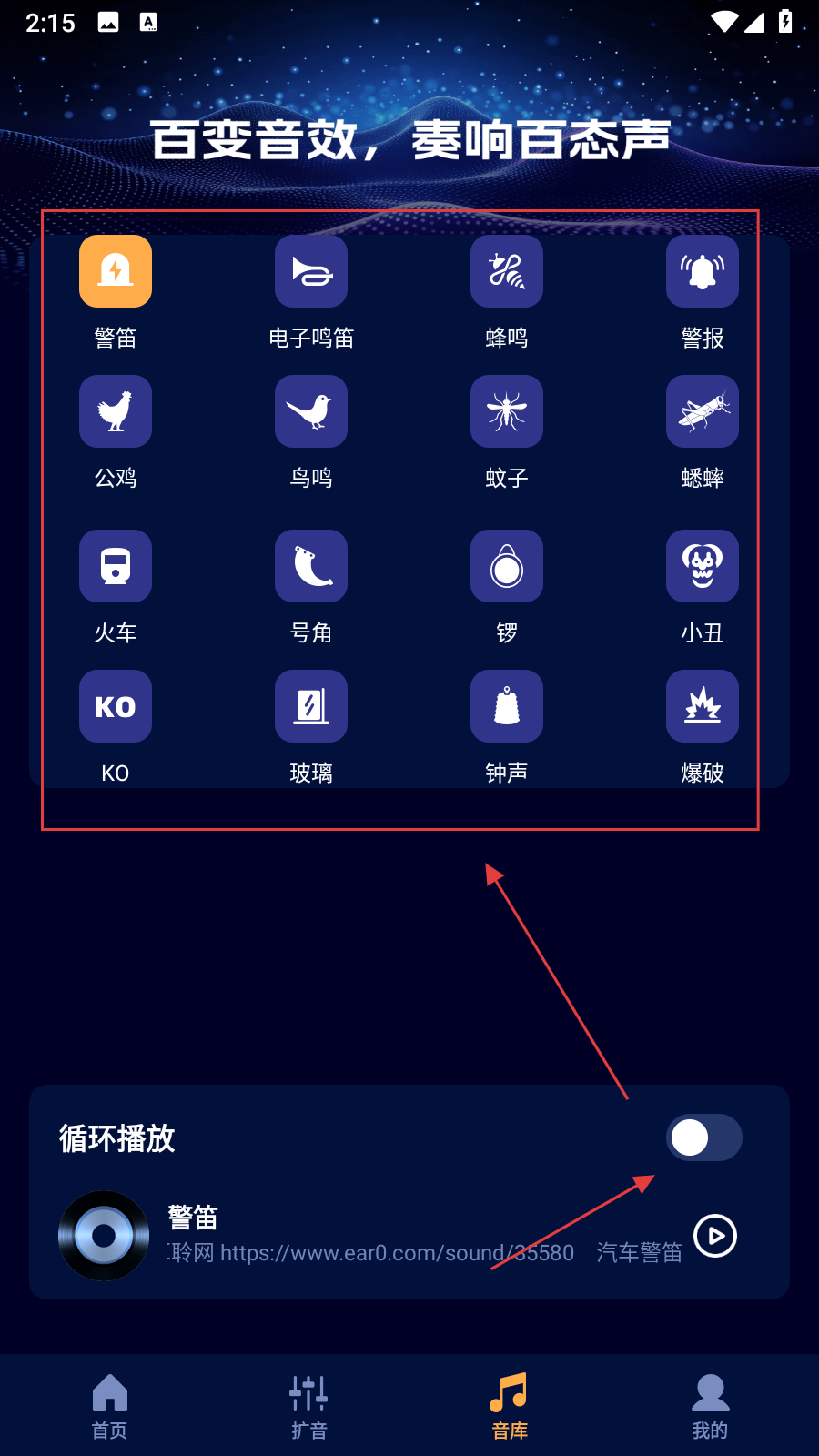 2、进入音库,这里有【更多音效】,选好心仪音效后,可开启【循环播放】让音效持续播放。