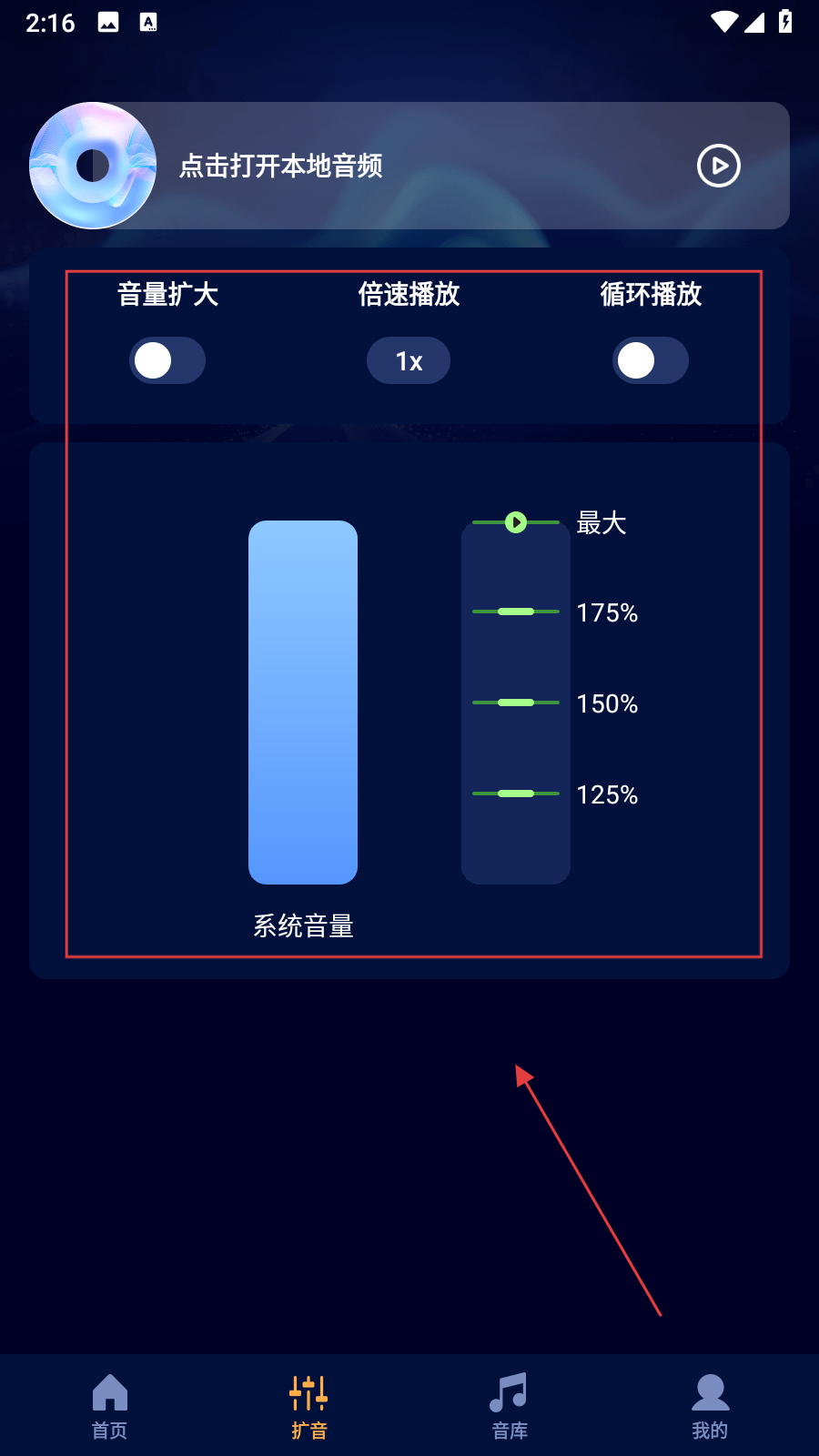 3、在扩音页面,能调节【音量扩大、倍速播放、循环播放】,还可调【整系统音量和扩增音量】。