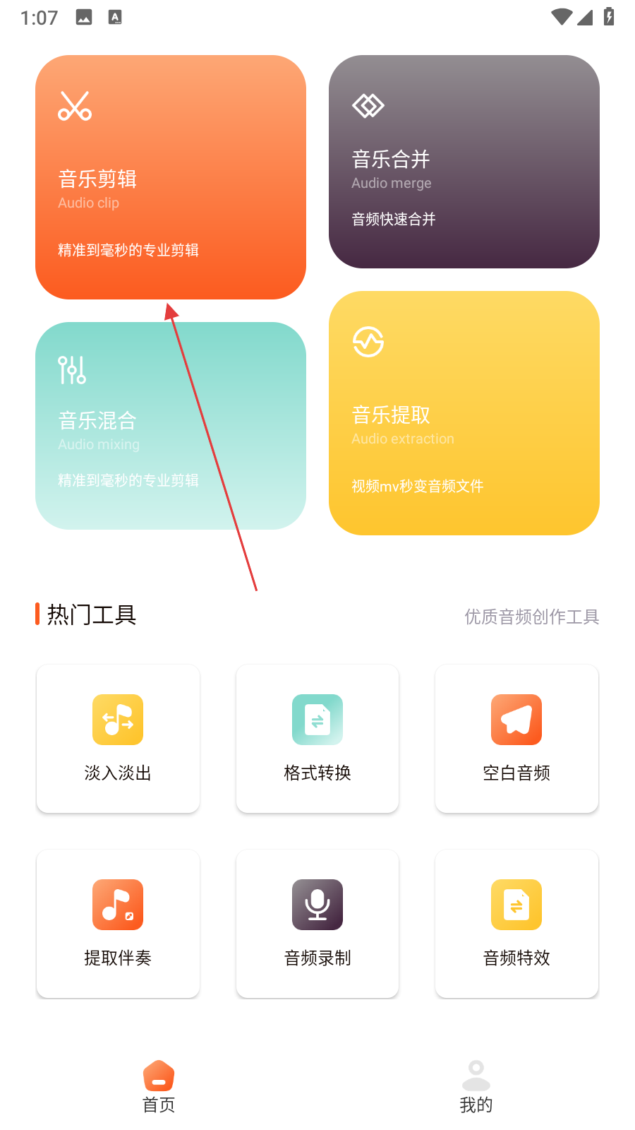 1、在音频编辑首页,点击【音乐剪辑】,进入选择音频页面。