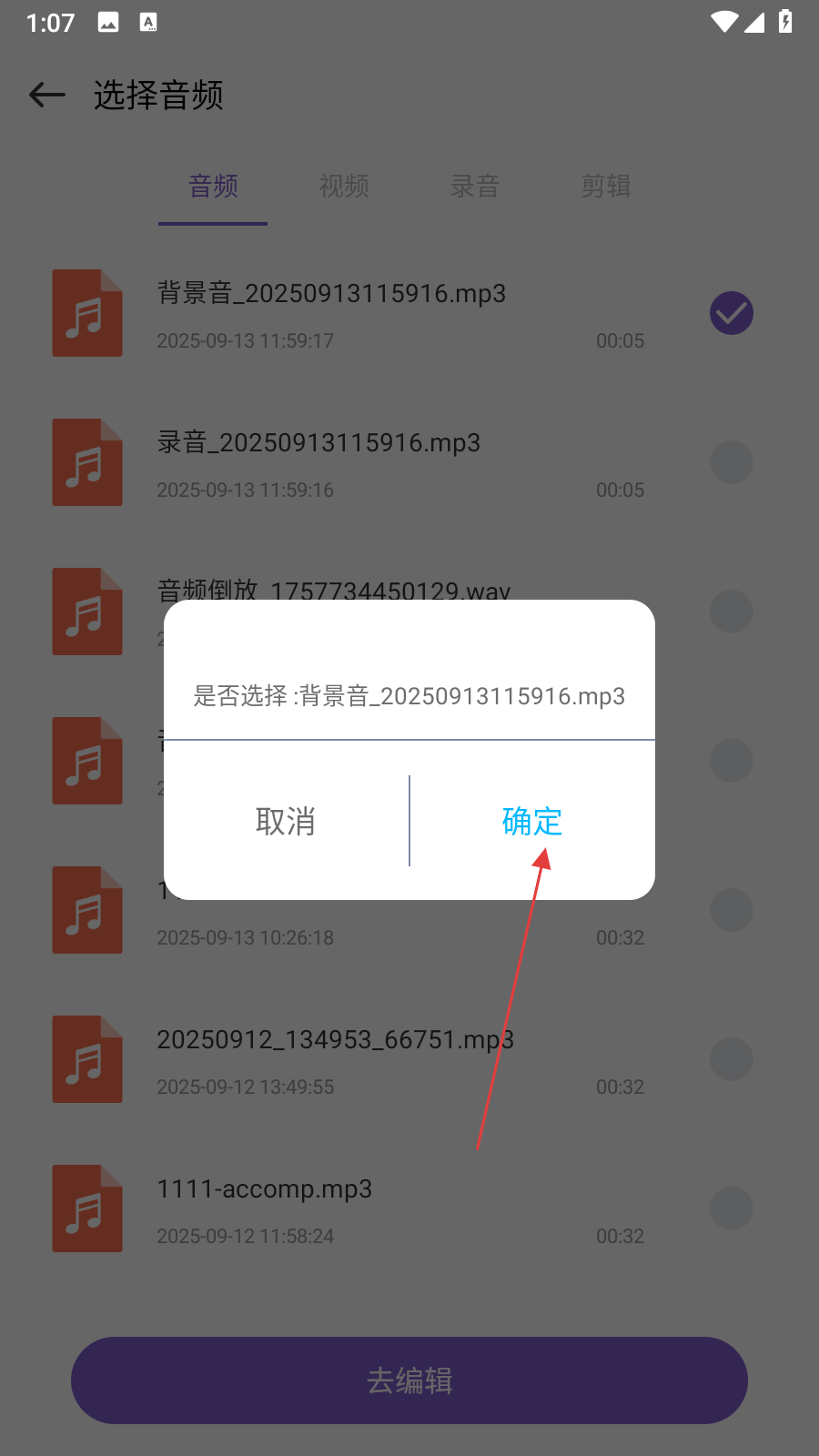 2、在选择音频页面,选中【要剪辑的音频】后点击【去编辑】,弹出确认选择弹窗。