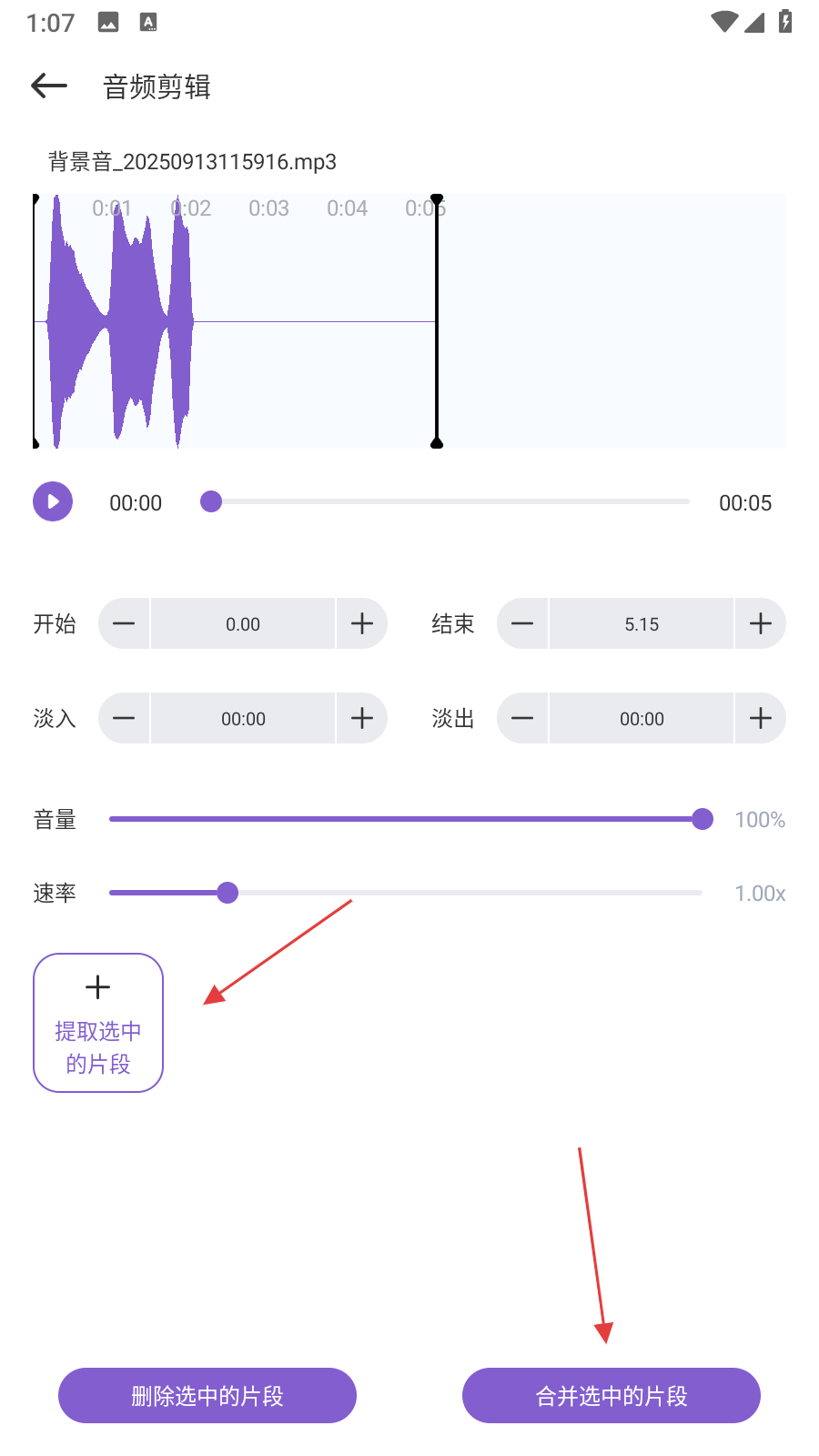 4、可【进行提取、删除、合并片段】等操作,然后点击【合并选中的片段】即可。