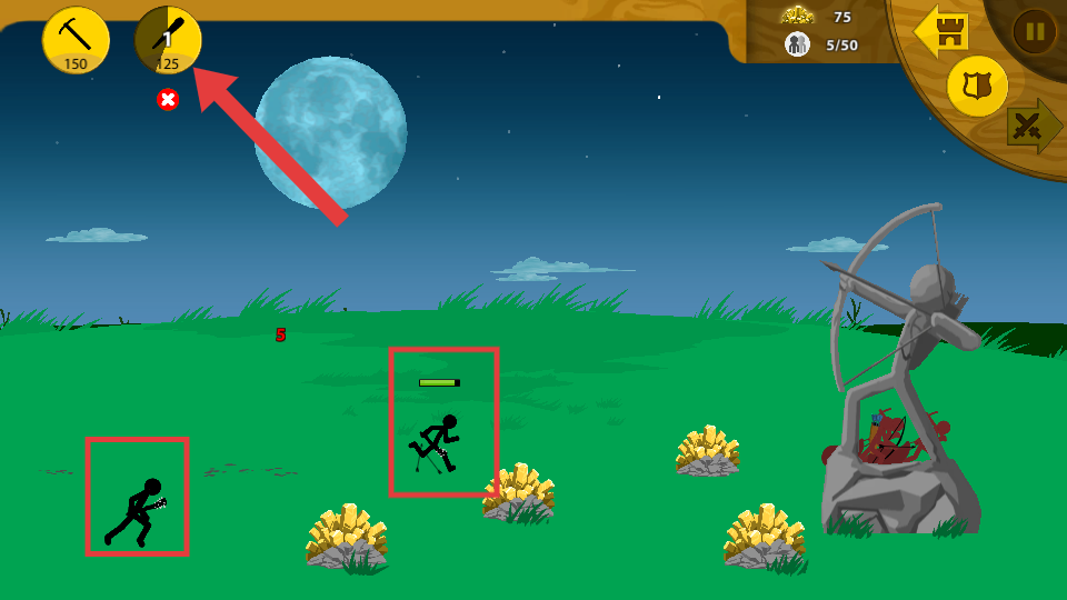 2、战斗中,合理利用资源生产如持剑等类型的火柴人士兵,壮大己方战力。